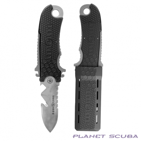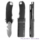 The Fibreglass Nylon Handle and Sheath are strong and light with multiple attachment options. You can attach the knife to your arm or leg with rubber straps, mount it to a webbing strap with the built in belt clip or bolt it onto your BCD with screws.
